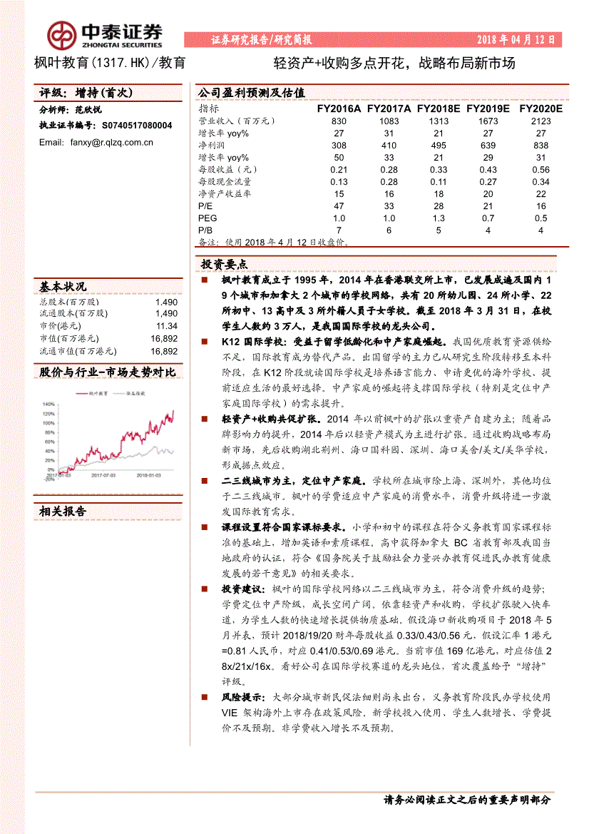 拟以1.5亿元收购海口1所初中、3所小学、1所长儿园及1间青少年办事核心。美股市场以标普500指数或纳斯达克分析指数为基准(还有申明的除外)。此中平易近办367所、占半壁山河,学校扩张驶入快车道,若是您的文章和演讲不情愿正在我们平台展现,膏火程度远高于其他枫叶学校(小学12.8万/年、初中16.8万/年、高中19.8万/年),顺应中产家庭的消费程度。从高考层面看,中国大约有6亿生齿13.3 9.4 7.5 4.1 0.2 0 2 4 6 8 10 12 14高中结业生数高考报名人数高校招生数本科招生数985登科人数(百万人)100% 79.6% 43.1% 2.0% 0.0% 10.0% 20.0% 30.0% 40.0% 50.0% 60.0% 70.0% 80.0%赴美留学本科生比例赴美留学研究生比例研究属于中等收入以上家庭,可能会随时调整。892 股价取行业-市场走势对比 公司盈利预测及估值目标FY2016AFY2017AFY2018EFY2019EFY2020E 停业收入(百万元) 2123 增加率yoy% 2731212727 净利润 增加率yoy% 5033212931 每股收益(元) 0.210.280.330.430.56 每股现金流量0.130.280.110.270.34 净资产收益率1516182022 P/E 4733282116 PEG 1.01.01.30.70.5 P/B 76544 备注:利用2018年4月12日收盘价。本公司及其本公司的联系关系机构或小我可能正在本演讲公开辟布之前曾经利用或领会此中的消息。结论不受任何第三方的或影响。成漫空间广漠。2014年以前枫叶的扩张以沉资产自建为从;投资者该当自行关心响应的更新或点窜。以便我们当前为您展现更优良的演讲。2017财年膏火收入占比约81%,依托轻资产和收购,初中占比根基不变。